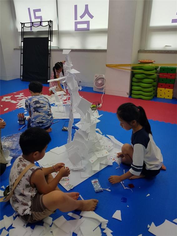 (사진: 프로그램 참여 어린이들이 우드락 조형물 만들기를 하고 있다)