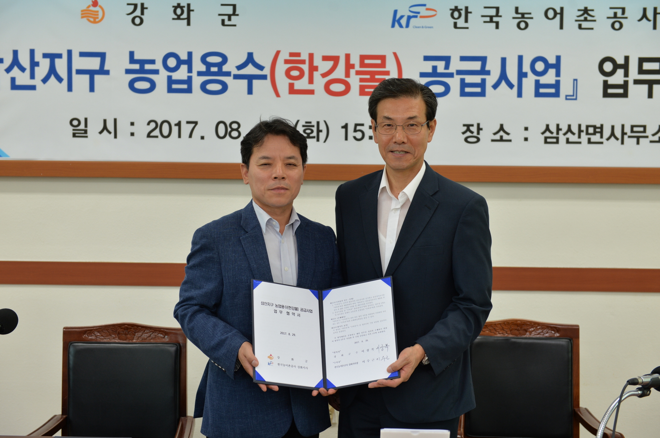이번 협약에 따라 양 기관은 강화군 삼산면 지역에 한강물 농업용수를 공급하기 위해 상호 협력하기로 했다.