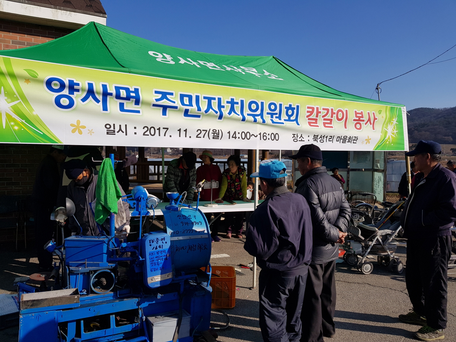 강화군 양사면 주민자치위원회(위원장 이희진)는 지난 27일 북성1리 마을회관 앞에서 칼갈이 무료 봉사를 실시했다.