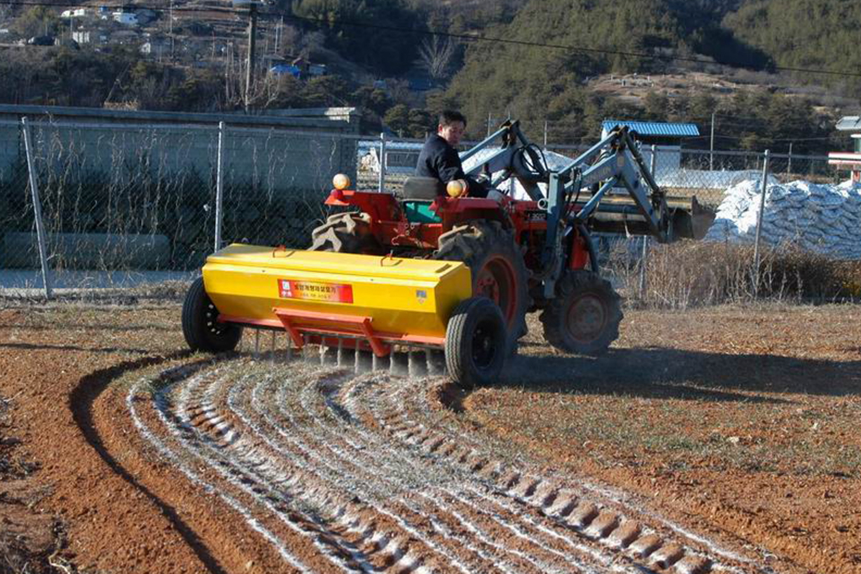 2. 석회(규산질) 살포기를 이용해 규산질을 뿌리고 있다.