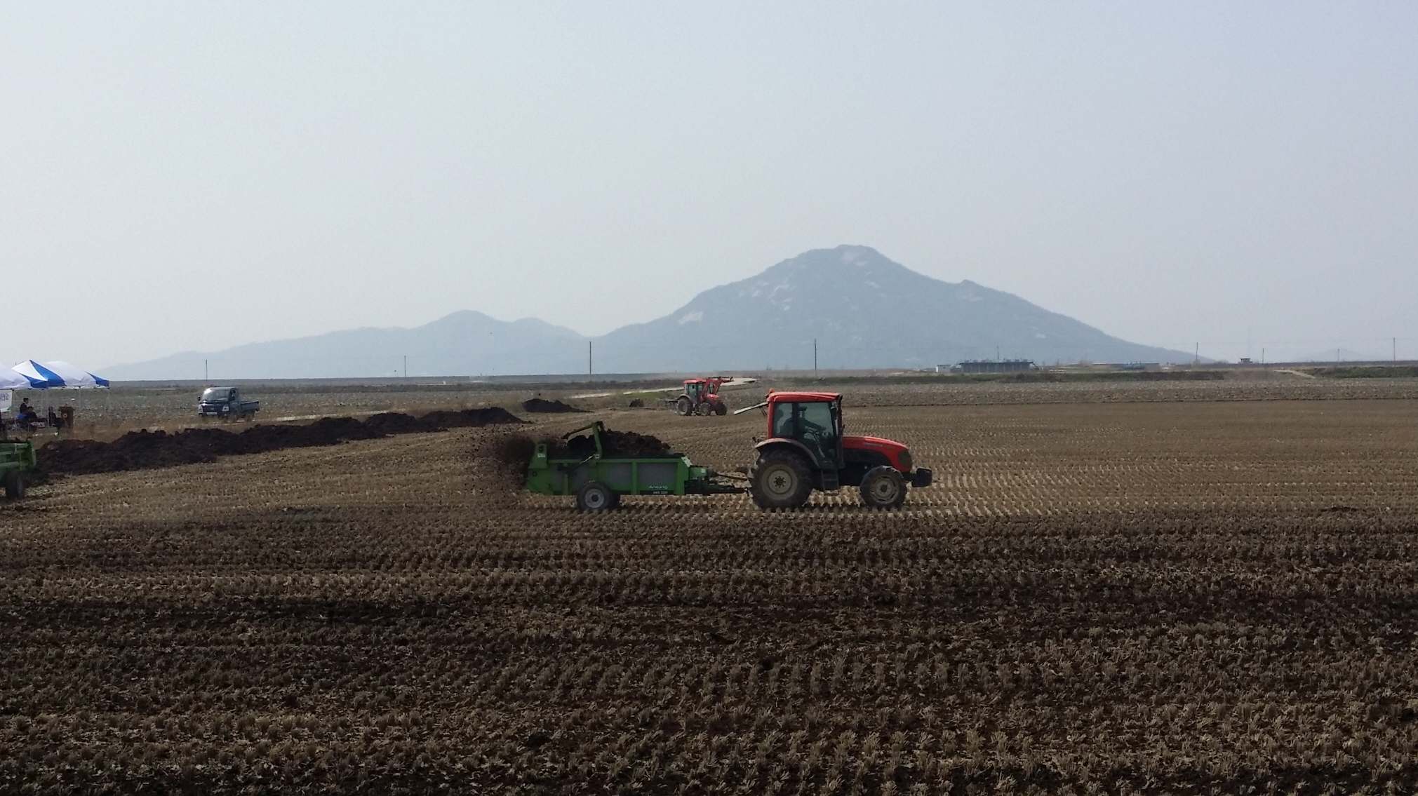 (사진 2매) 1. 논에 유기질 비료를 살포하고 있다