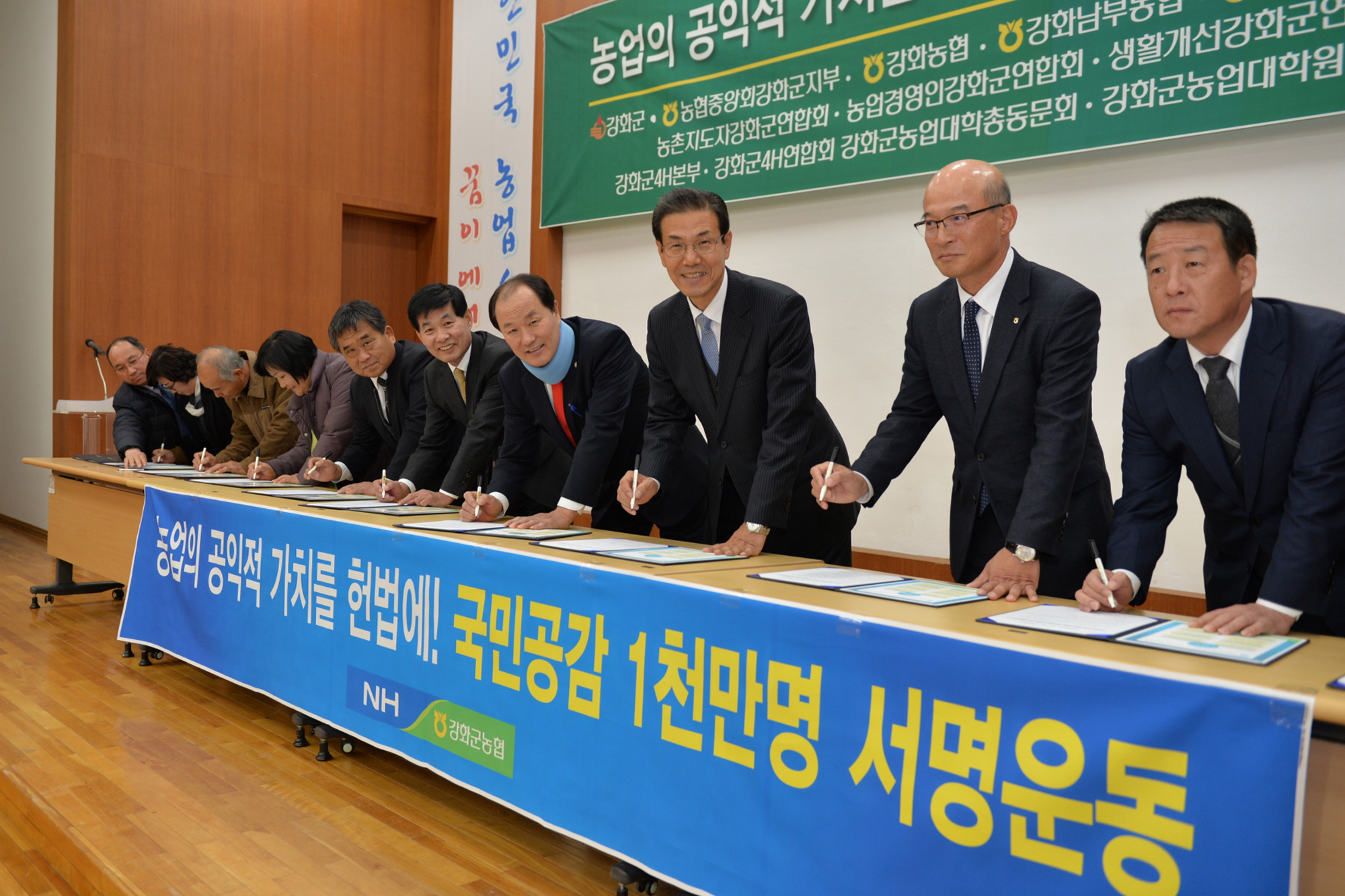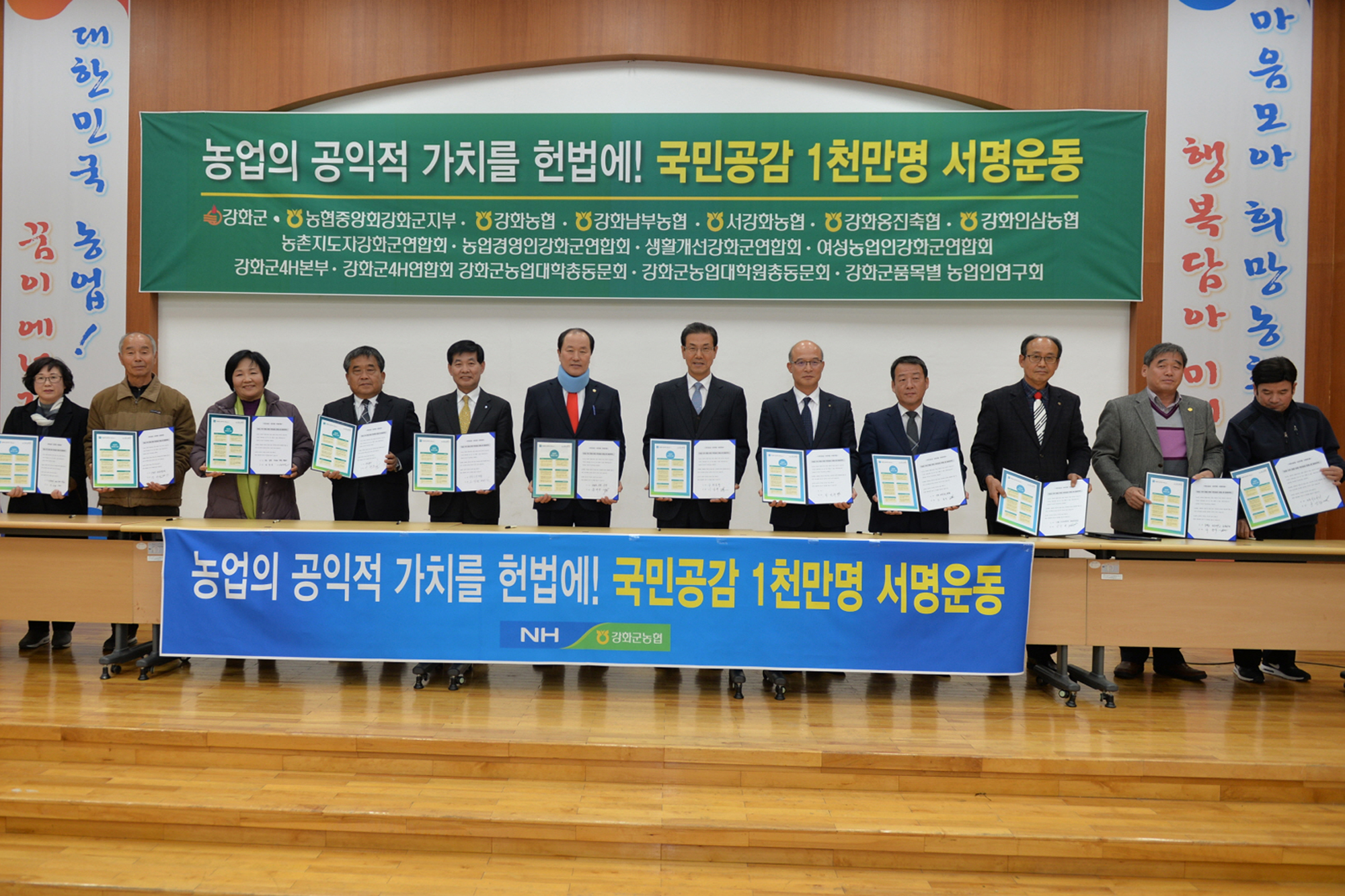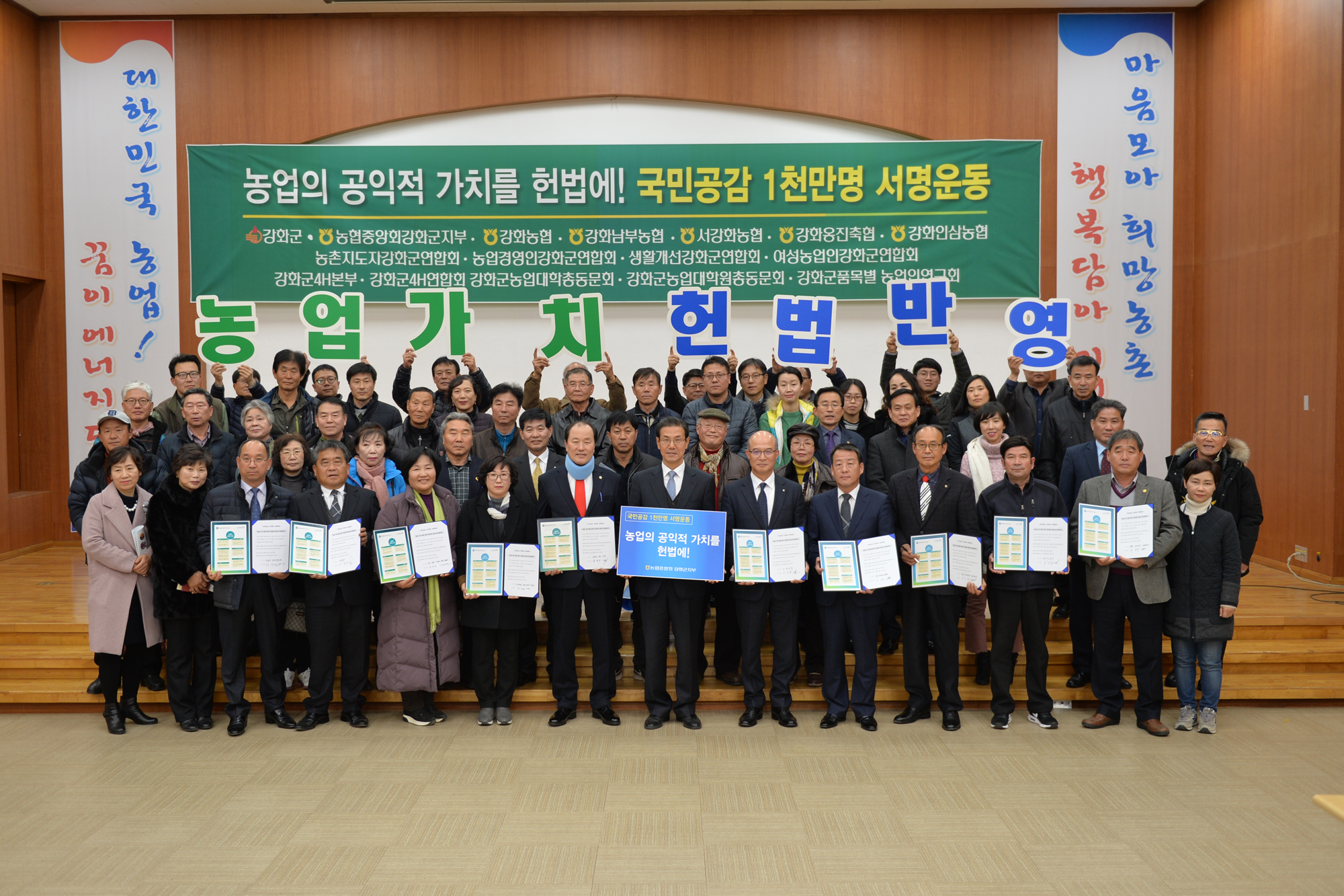강화군이 농업의 가치를 헌법에 반영하기 위해 농협 및 농업인단체 등과 함께하는 국민공감 1천만명 서명운동을 펼쳐 주위의 이목을 끌고 있다.