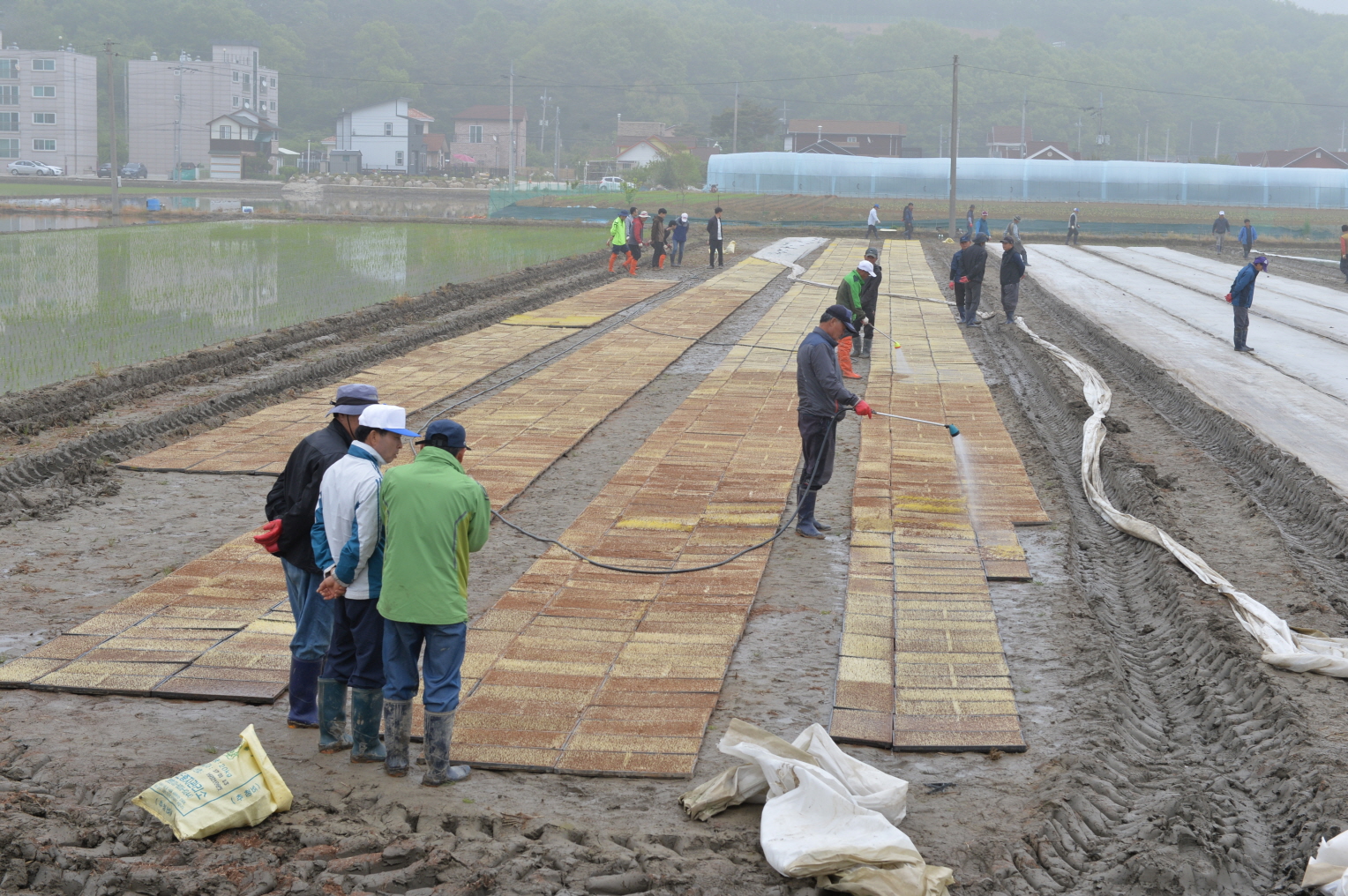 (사진 2매) 농촌지도자회 회원들이 못자리를 설치하고 있다