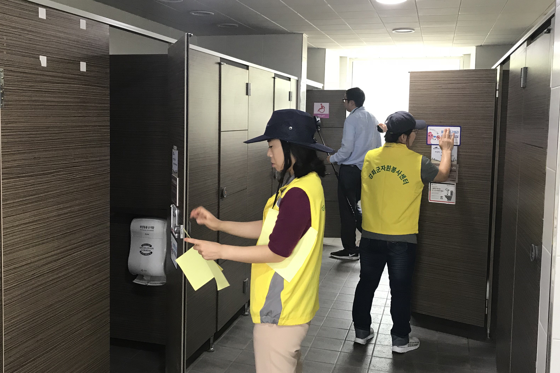 (사진 2매) 군 관계자가 공중화장실 내 불법 카메라 설치 여부를 점검하고 있다.