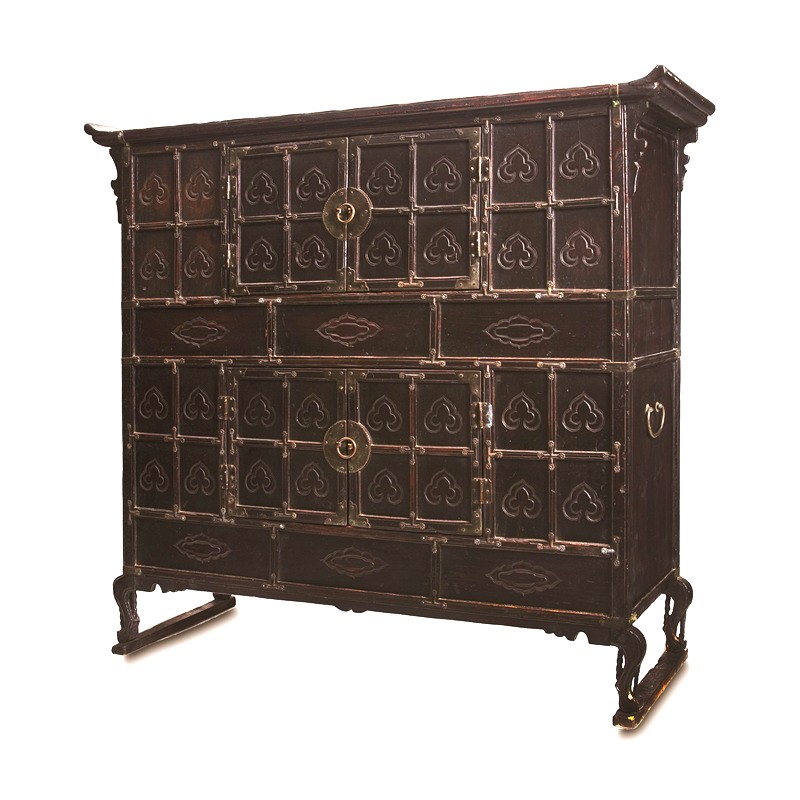 상류층에서 사용된 것으로 여의두문이 4단으로 조각되어 있는 이층조각책장은 서책과 두루마리 문서를 넣어두는 가구이다.