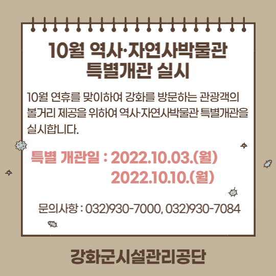 강화역사박물관, 강화자연사박물관 10월 연휴 특별개관 안내