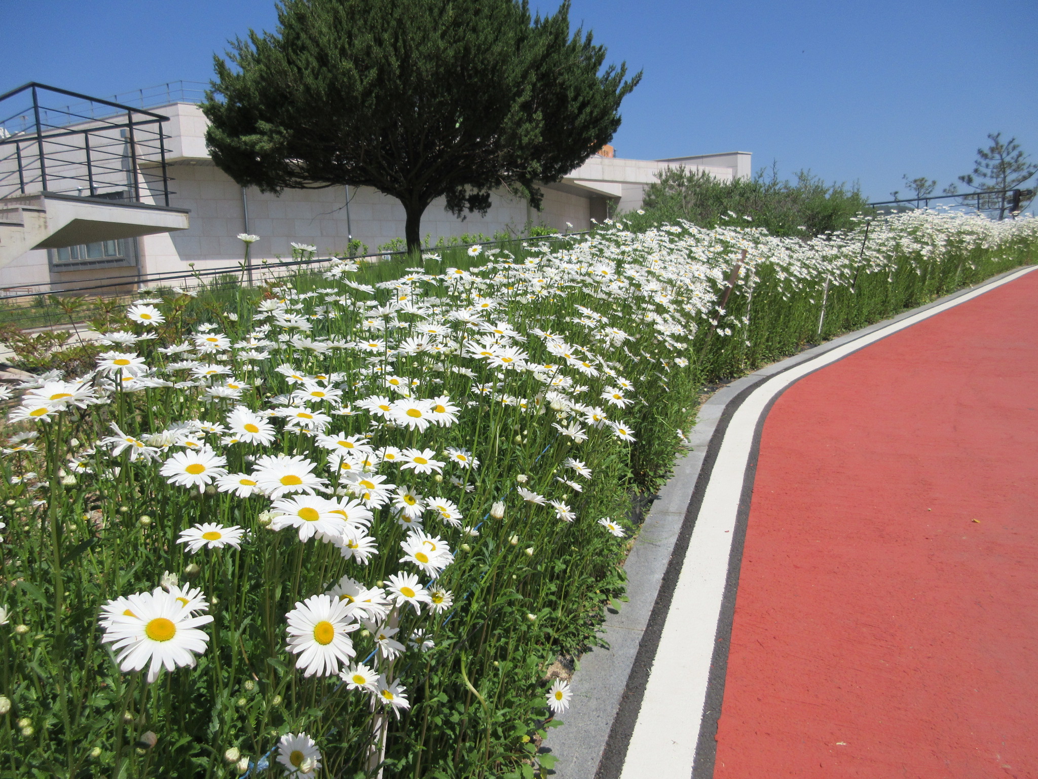박물관이 샤스타데이지로 한껏 멋을 냈습니다.