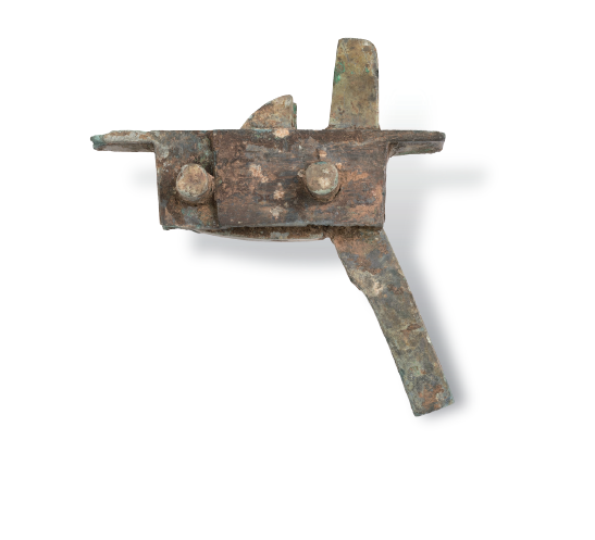 이 유물은 노弩의 틀 뒤 끝에 부착된 청동제 발사장치인 노기弩機이다. 쇠뇌弩는 나무