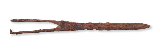 부분은 제비꼬리형태燕尾形로 작은 철정으로 자루를 고정시킨 흔적이 한쪽