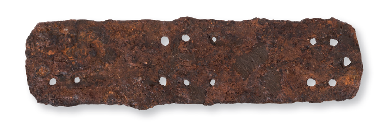 평면 팔각세장방형의 철제 찰갑편으로 일부 부식되었으나 원형을 유지하고 있다. 크게 세 곳으로 나누어 투공하였는데 중앙에 6개, 좌우로 각 2개, 5개를 일정한 간격으로 투공하였다.