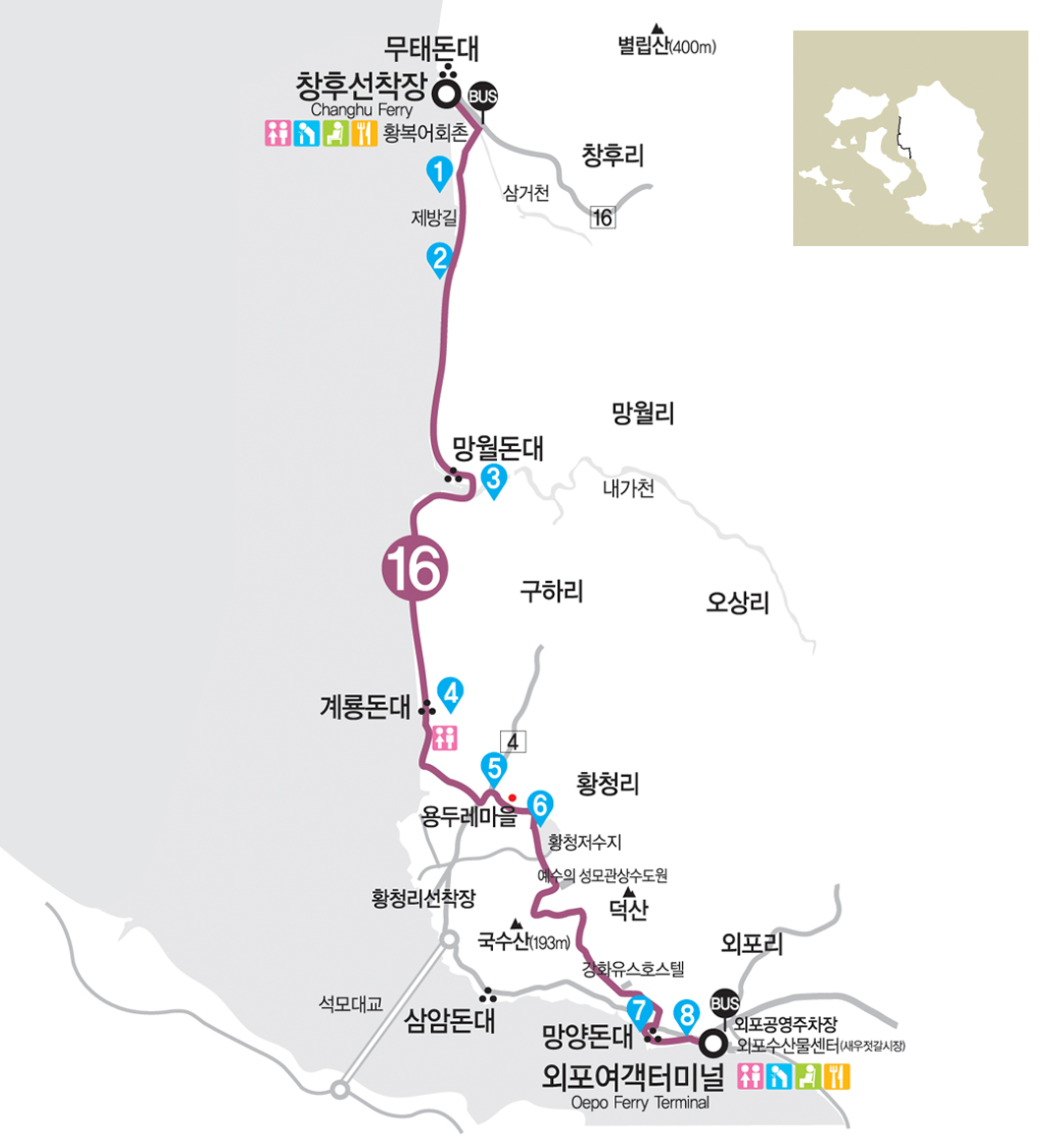 창후선착장 - 외포여객터미널 거리 13.5km / 소요시간 4시간