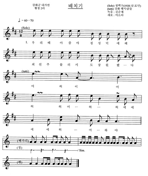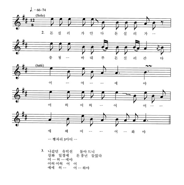 최선주 불러서 도장원 했-다 어 허 어 어 허 허 어 - 허 허에에 에 에 허 - 어 - 하 야 2.돈실러 가안다 돈실러가 - 충청-바대루 돈실러 간 다 어 - 어 - - 에 야 어 허 어허-어 어 - - 에 헤 어 - - 어 - 화 야 3. 나갔던 유덕석 돌아느니 강화 일경에 돈 풍년 들었다 어 - 허 - 에야 어허 어허 어 어 에에 허 - 어 - 하야