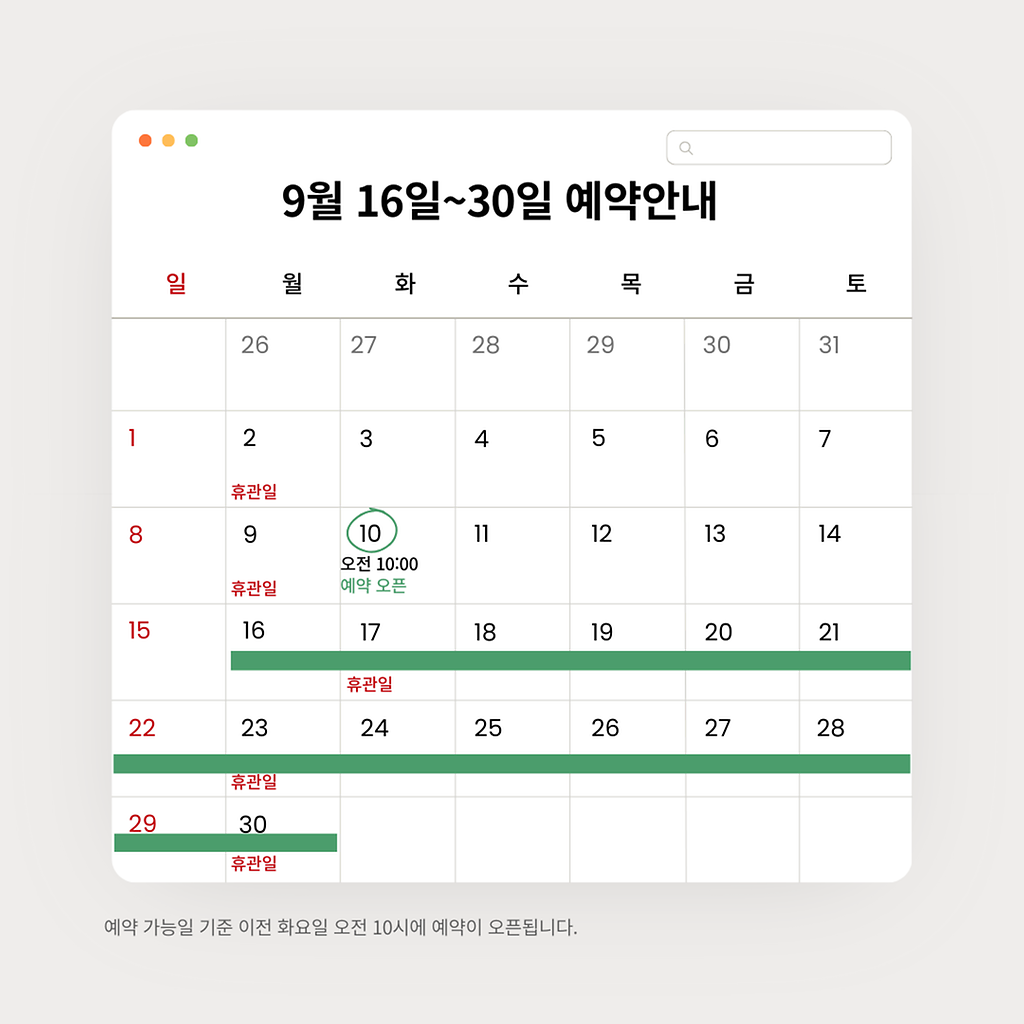 이번 9월 16일~30일 예약은 9월 10일 오전 10시에 오픈됩니다.