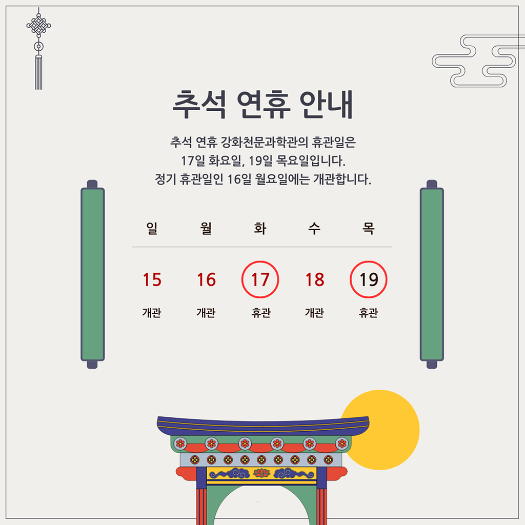 안녕하세요, 강화천문과학관입니다. 추석연휴 동안의 개관일과 휴관일을 알려드립니다.