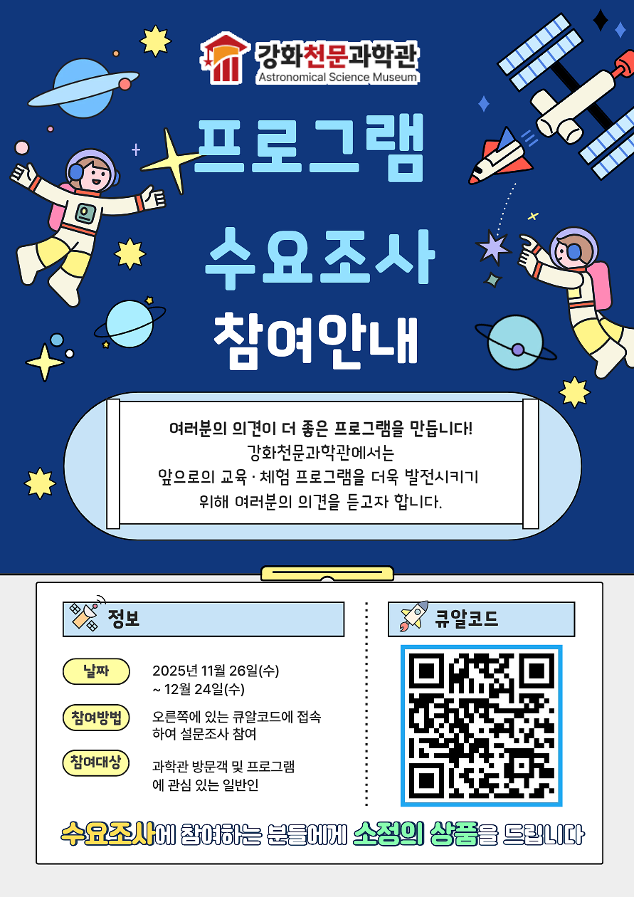 안녕하세요 강화천문과학관입니다. 2025년 11월 26일 부터 12월 24일까지 프로그램 수요조사 진행합니다! 많은 참여 부탁드립니다 :) 수요조사 참여 후 강화천문과학관 방문시 소정의 선물을 드립니다! 아래는 설문조사 링크입니다.