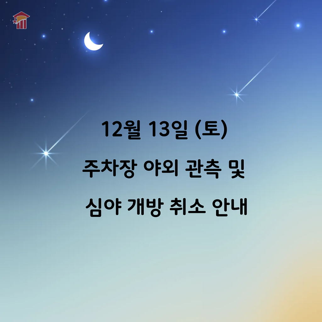ㅇ 12월 13일, 토요일 주차장 야외 자유 관측과 심야 개방은 진행하지 않사오니 방문에 착오 없으시길 바랍니다.
