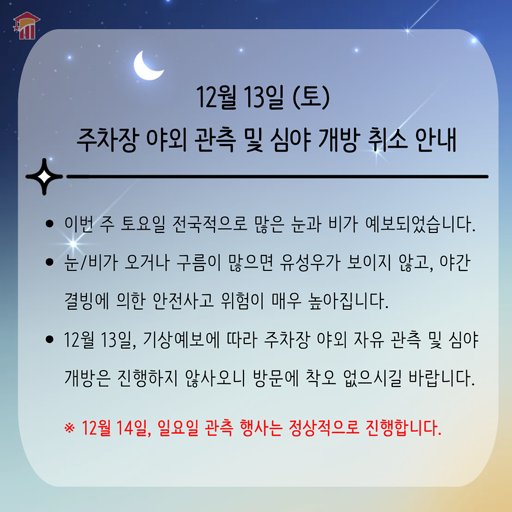 [공지] 12월 13일(토) 야외 관측 및 심야 개방 취소