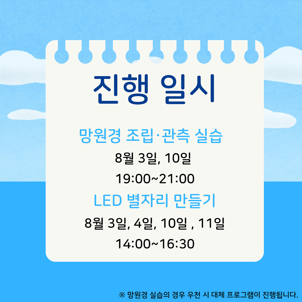 ※ 망원경 조립·관측 실습 및 심야 관측회의 경우, 우천 및 기상 악화 시 대체 프로그램이 진행됩니다.