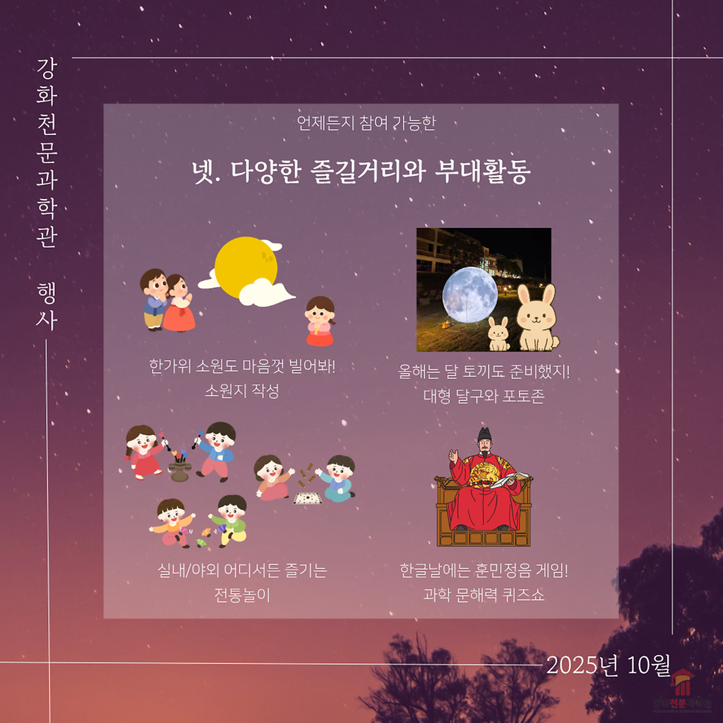 - 소원지 작성, 대형 달구 및 포토존, 실내외 전통놀이, 한글날 문해력 퀴즈쇼 등